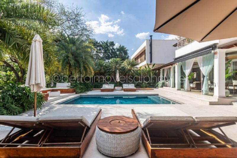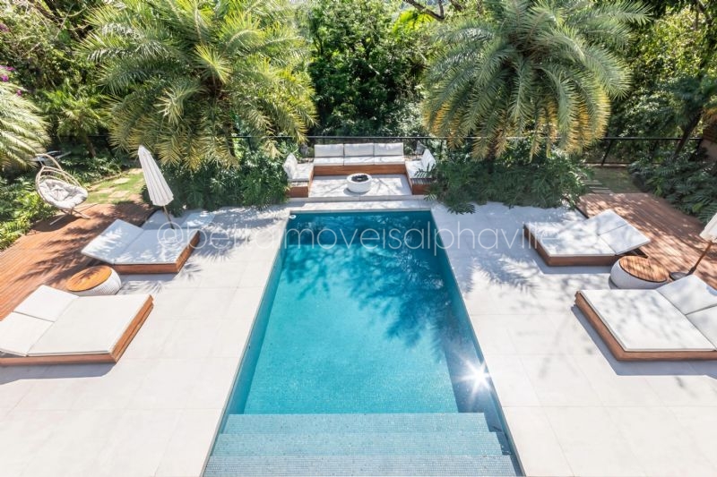 5 amplas suítes, amplo living com lareira, home theater, escritório, lavabo, ampla cozinha planejada, rica em armários, sala de almoço, espaço gourmet com churrasqueira, piscina, planejados Florence e Ornare, a casa tem mármore italiano em todos os ambientes, incluindo paredes externas, 5 vagas de garagem. 880m² construídos em terreno de 880m².