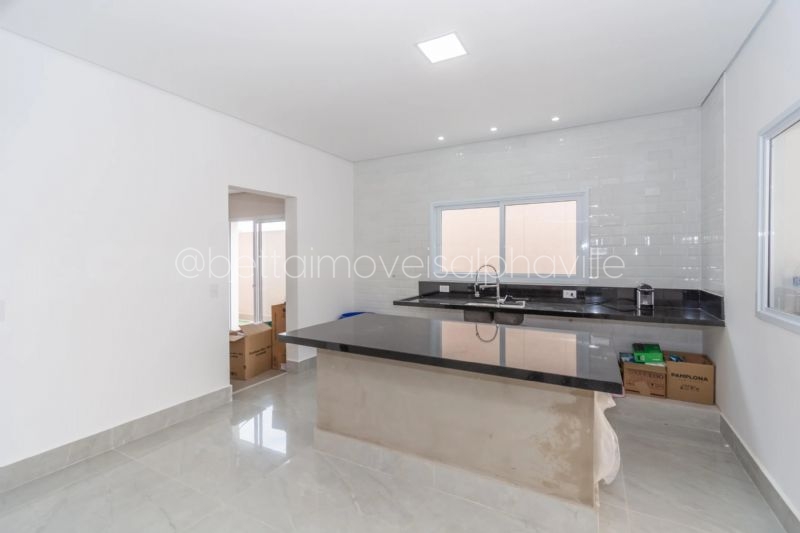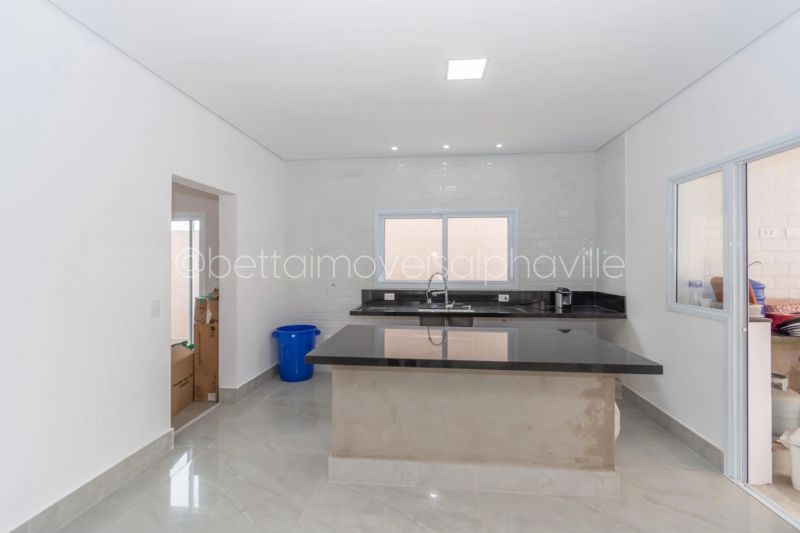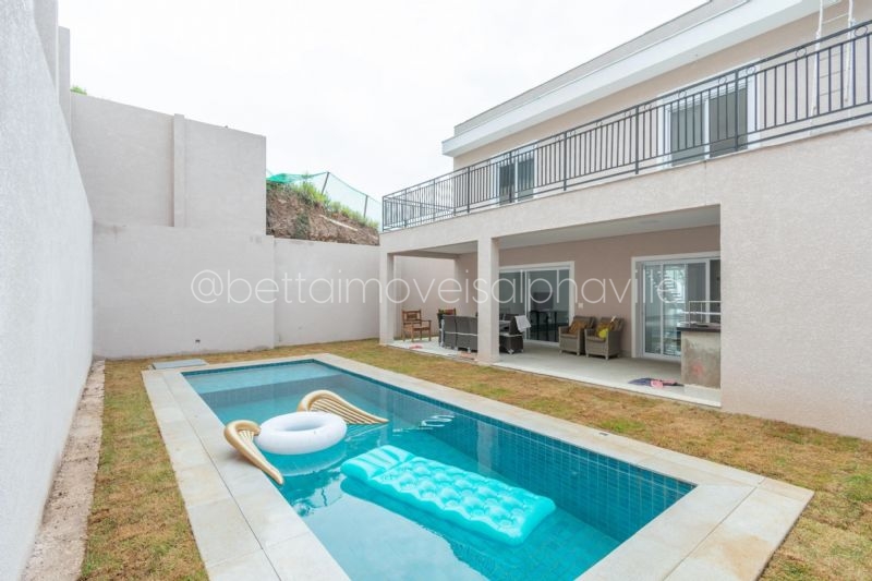 4 dormitórios com sacadas e armários, sendo 3 suítes, e a master com lareira, closet e jacuzzi, living para 2 ambientes com pé direito duplo e lareira, varanda acoplada a sala de jantar, hall de entrada, escritório, lavabo com jardim de inverno, cozinha gourmet planejada com ilha central, despensa, lavanderia, dependência de empregada, salão de festas com home theater, carramanchão com churrasqueira, forno a lenha, sauna e banheiro, piscina com deck de madeira, Spa, mini campo de futebol, jardim com árvores frutíferas, depósito, com luz natural em todos os andares, 7 vagas de garagem sendo 2 cobertas. Possui privilegiada vista panorâmica de Alphaville com frente voltada para área de reserva permanente. 800m² construídos em terreno de 1.290m².
